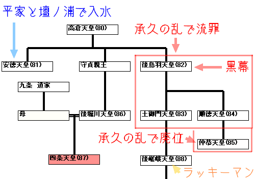 負けた側の首謀者・後鳥羽系列の天皇一族が一斉処分されちゃうんだ。